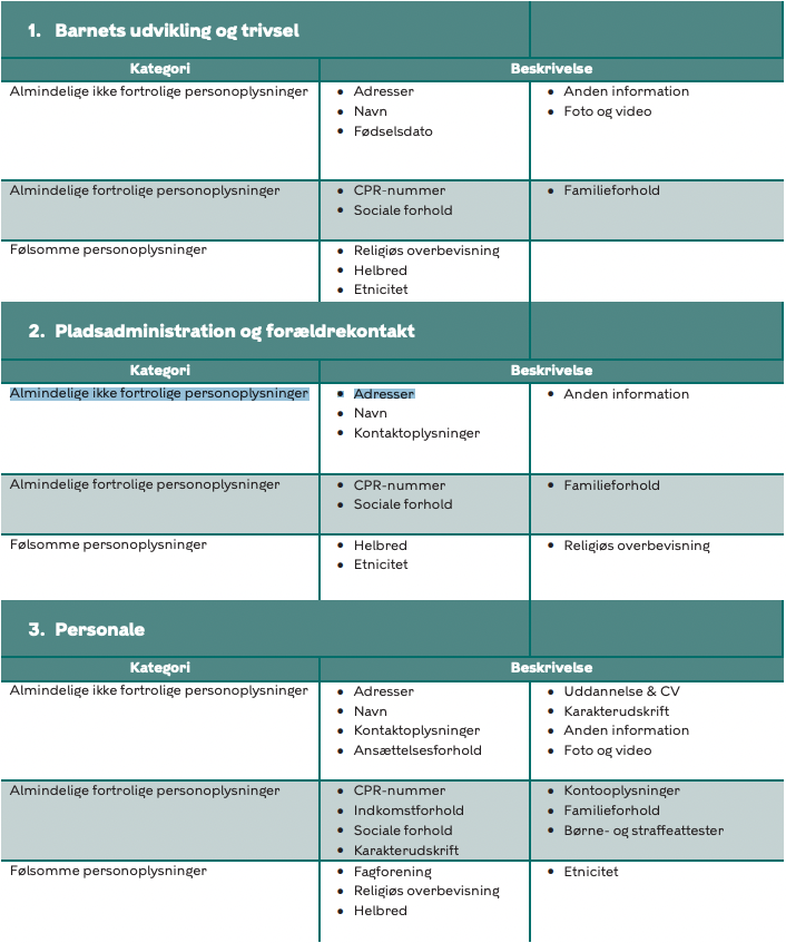 2. Udover det pædagogiske arbejde med barnet, behandler vi personoplysninger om både barnet og forældre, til den daglige administration og forældrekontakt. Den daglige administration består blandt andet af  administration af barnets plads i institutionen. Som en del af forældrekontakten, behandles oplysninger til  brug for samarbejdet med forældrene om barnet, og andre administrative opgaver.